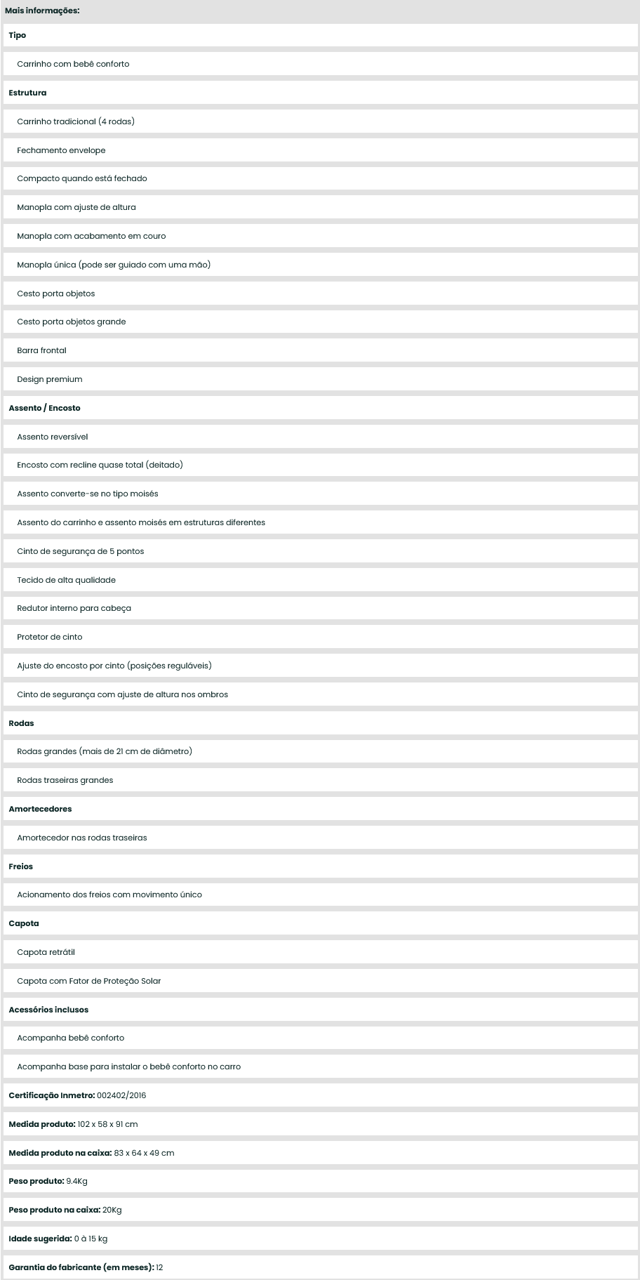 Coleção especial para o carrinho Epic, com função moisés que, além de incluir bebê conforto, tem base para instalação em todos os carros, com sistema Isofix ou cintos. No conjunto Travel System Epic Lite Trio Edição Especial da Infanti, a manopla e a barra frontal ganham revestimento especial, para maior resistência, além de conferir um toque de beleza. O carrinho tem tudo o que é preciso para deixar o bebê muito confortável: função moisés, para a soneca tranquila enquanto ele é recém-nascido, e assento reversível, para ele passear de frente para os pais ou voltado para o mundo. O assento tem quatro ajustes possíveis, enquanto o encosto tem múltiplas posições, facilmente reguláveis.